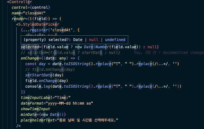 selected의 형식은 Date가 들어가야해서 onChange값을 string으로 보내면 오류가 나는것이었다.